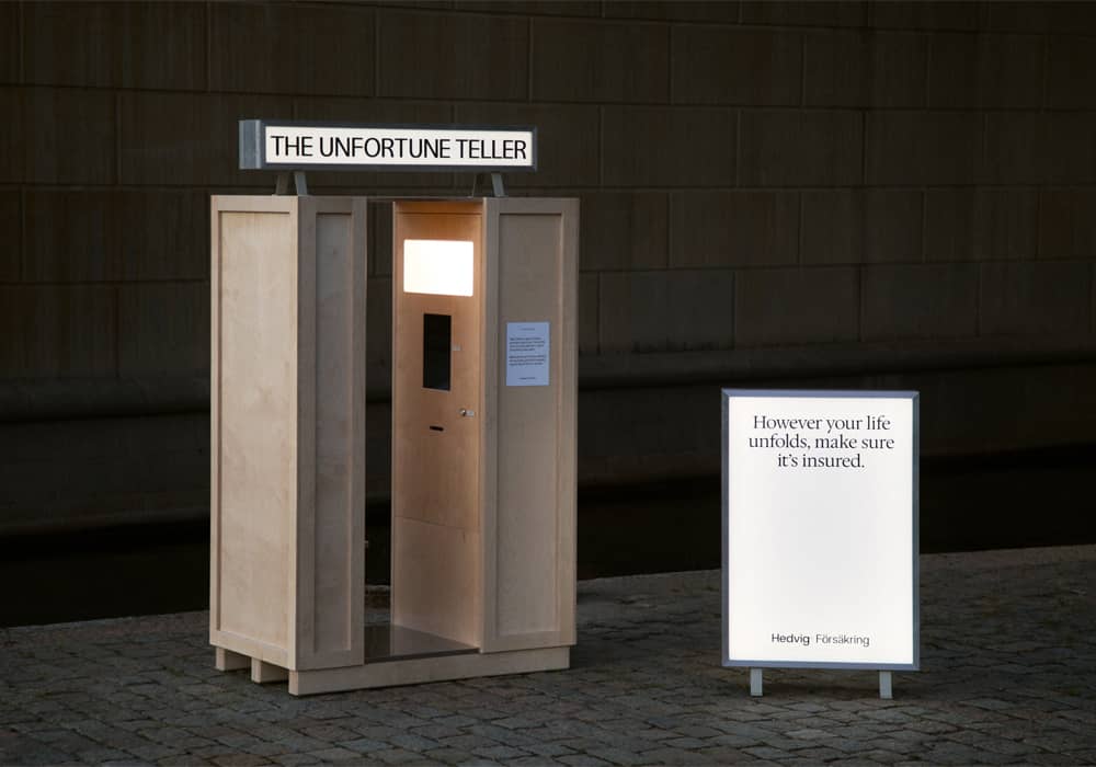 The Unfortune Teller är ett fotobås som agerar både spådam och bitsk kommentator av din framtid. Precis som ett vanligt fotobås skriver den ut din bild, men ovanför bilden får du också en personlig “unfortune”, en kortfattad roast, om din framtid. Tänk fortune cookies, fast tvärtom. Med fotot och spådomen kommer ett erbjudande på Hedvigs studentförsäkring. Några exempel på “unfortunes”: