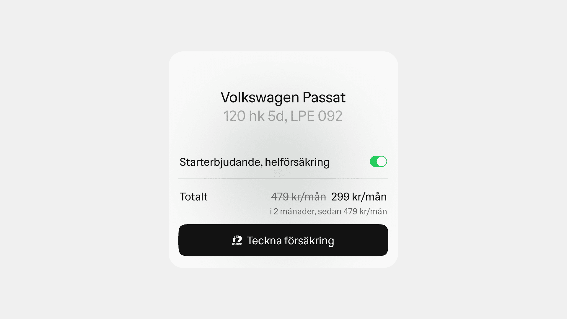 Kunden tecknar vårt starterbjudande tillsammans med säljaren i samband med köpet av bilen och får ett rabatterat pris på vår bilförsäkring i 60 dagar. Kunden kan sedan välja att förlänga försäkringen. Allt sker digitalt.